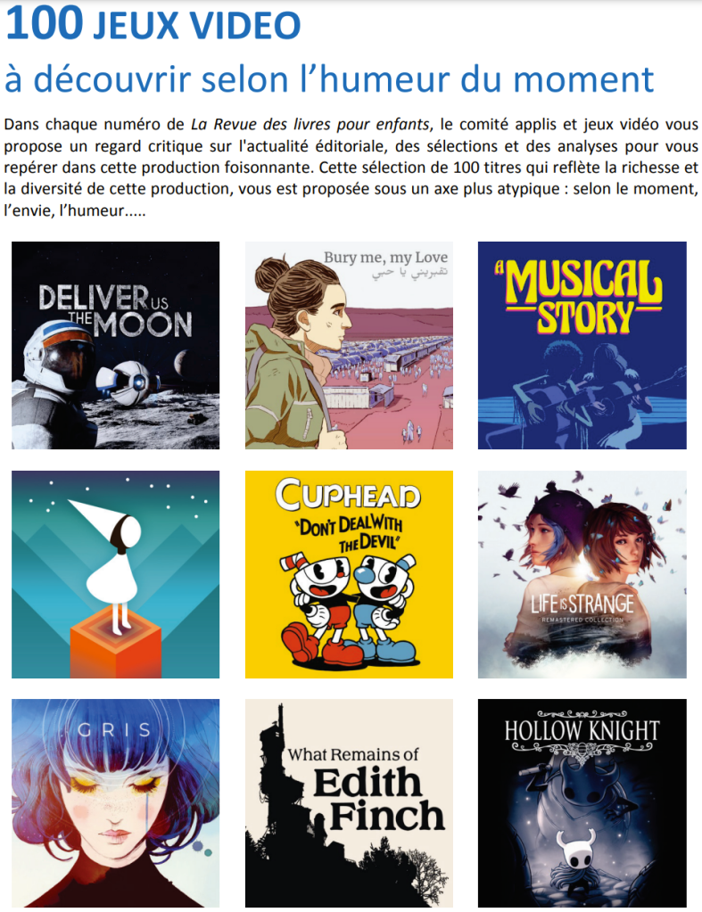 Il est également à noter que le CNLJ offre des compléments à sa revue sur son site internet. A l’occasion du n°331, nous y retrouvons notamment une sélection de 100 jeux à découvrir selon son humeur, parmi lesquels Bury Me, My Love, Cuphead, Fall Guys, What Remains of Edith Finch ou encore Mario Kart 8 Deluxe et Rocket League, témoignant en cela de cette envie de prendre ce média dans son ensemble, du AAA à l’indé.