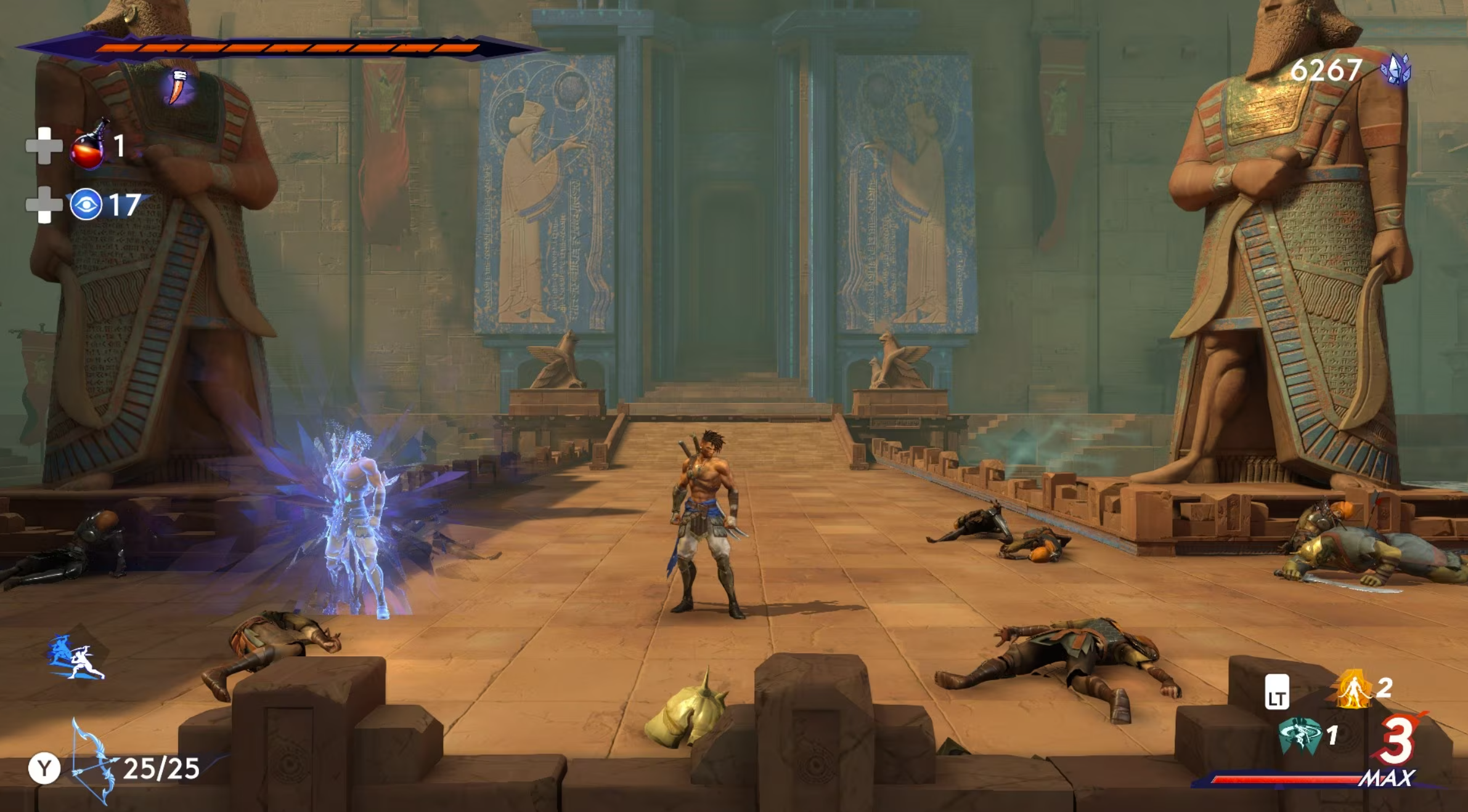 Mais attention, c’est un petit malin ! Car si avec du recul le titre semblera finalement bien chiche en audace, il n’en demeure pas moins un jeu qui marche en définitive plutôt bien. Je le disais plus haut, les premiers temps de jeu ne donnent pas vraiment matière à voir en quoi The Lost Crown propose quoi que ce soit de véritablement neuf, si ce n’est au regard de sa propre licence finalement. Mais à mesure que l’on avance, il tente tout de même de se faire ses propres idées et de renouveler un tant soit peu son gameplay. Cela passera pour l’essentiel par l’obtention de pouvoirs que Sargon, notre héros du jour, obtiendra en récoltant des plumes elles-mêmes obtenues en accomplissant les principales étapes de son aventure. Certaines des aptitudes ainsi apprises sont pour le moins classiques : arc, grappin qui ne dit pas son nom, possibilité de faire apparaître ou disparaître certaines plateformes à notre guise…