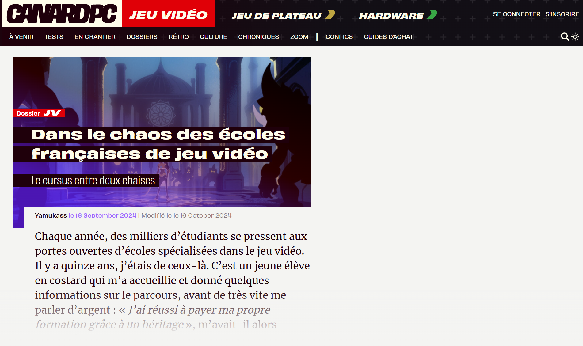 Toujours plus sans doute, si l’on continue de faire défiler le paysage idyllique que la ministre nous présente. Car la France est riche de ses parcours de formation en la matière ! Certes mais comment ne pas avoir en tête les éléments développés dans le numéro 458 de Canard PC (Septembre 2024) où Noddus et Yamukass reviennent longuement sur les difficultés rencontrées par les étudiant.e.s dans ces écoles, sur l’entre-soi que représente l’industrie en bout de fil, sur la manière dont les plus désillusionné.e.s finissent tout bonnement par abandonner un navire qui prend la flotte. Comment ne pas penser au souci que représente l’absence flagrante de filières publiques fortes dans ce cadre de formation ?