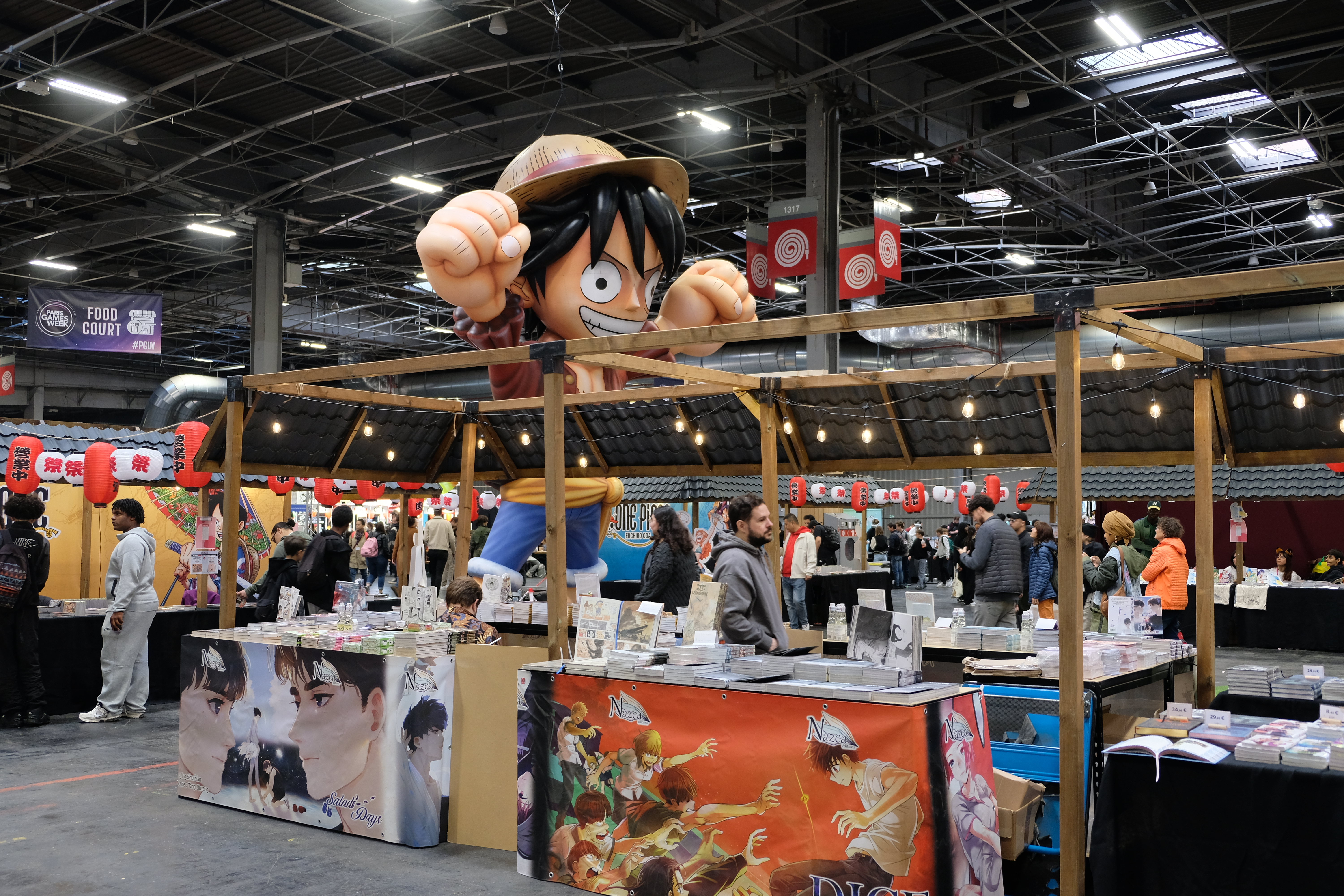 Au milieu de cet espace de produits dérivés et autres se trouvait enfin le fameux village manga, « un espace impressionnant de près de 400 m² entièrement dédié à la culture manga » si j’en crois le site officiel de la PGW. Reste que ces 400 m² ne sont en définitive pas bien intéressants eux non plus. Le tout se compose finalement en 4 rangées de tables formant un rectangle : tables sur lesquelles s’accumulent une certaine variété de mangas, j’en conviens ; rectangle au sein duquel il n’y a, une fois de plus rien. Sous les yeux d’un Luffy gonflable géant, un pauvre cerisier en fleur tente désespérément de créer une ambiance « japonisante » pour attirer le chaland. Aussitôt entré dans ce « village », aussitôt reparti.