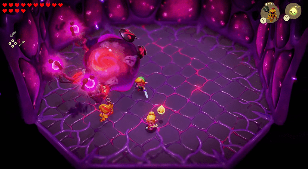 Là où je rejoins cette approche également, c’est en ce qui concerne le combat final, ce qui est le deuxième point où je pense que Nintendo manque son coup. C’est ici que je vais sans doute un peu spoiler le jeu alors attention. Lors du combat contre Nihil, le boss final, nous ne combattons plus seul mais bien aux côtés de Link, libéré un peu plus tôt. Le renversement des habitudes trouve donc ici un premier frein en ce sens que Link n’est pas libéré parce que nous avons vaincu le dernier boss mais bien en vue de le combattre. Car en effet, le petit héros à la tunique verte sera dès lors à nos côtés pour toute la fin du jeu.
