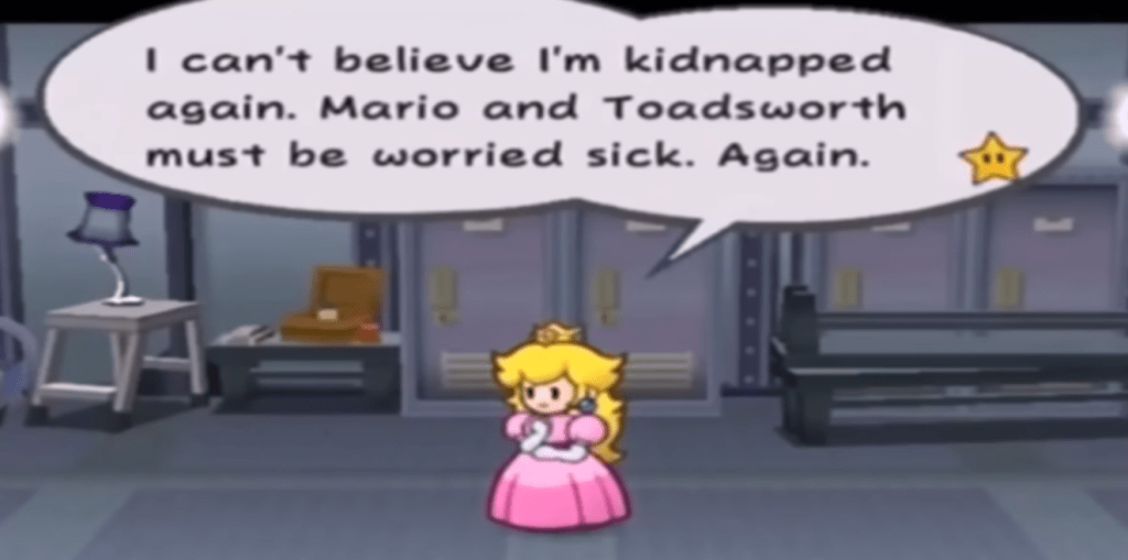 Le fait d’installer ainsi la femme comme outil narratif au service de la quête du héros peut être relié à la figure de la demoiselle en détresse (il s’agit bien de placer une femme dans une situation de captivité pour donner un sens ou un objectif à la quête du héros). Le trope ainsi désigné va évidemment se retrouver dans un grand nombre de jeux vidéo. Si le personnage de Samus, pour ce qui concerne notre sujet, s’extirpera par nature de cette approche, Zelda et surtout Peach y correspondent bien plus.