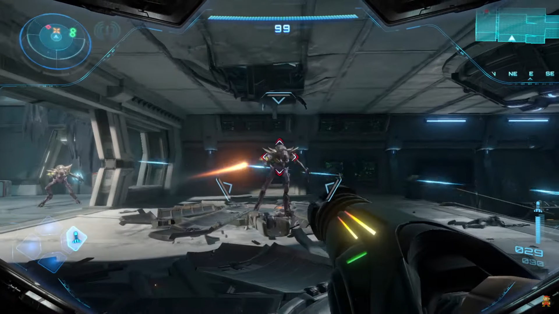 C’est le même phénomène qui pourra alors être observé dans la trilogie Metroid Prime, seuls jeux de la licence à faire le choix d’une vue à la première personne. Ici, comme dans les deux jeux pris en exemple par Marion Coville, le corps de Samus est encore plus mis en retrait qu’il ne l’était déjà avec son armure. La femme sous l’armure ne se rappelle alors plus à nous que par le reflet de ses yeux dans la visière de son casque, à la faveur de certains effets lumineux produits par ses armes.