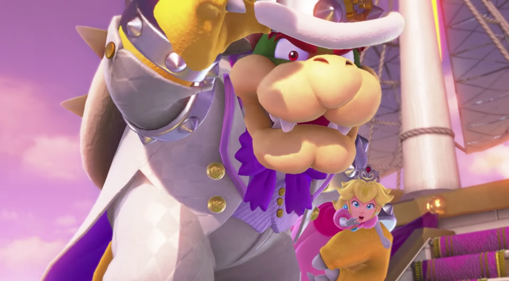 Nous l’avons vu dans la précédente partie de ce dossier, Zelda a régulièrement été l’un des objectifs de Link dans les jeux de la licence, en ce sens qu’elle doit être libérée par lui. Bien que son statut ait évolué depuis ses débuts, il n’en est pas véritablement de même pour la princesse Peach qui continue encore et encore de se faire enlever par Bowser dans les jeux Super Mario Bros. L’année 2024 constitue une petite exception (nous y reviendrons ensuite) et si certains titres de la série – parce que proposant du jeu en coopération – la retirent de ce rôle et permettent de l’incarner comme une des héroïnes (Super Mario 3D World, Super Mario Bros. Wonder), Peach demeure encore très fermement engoncée dans cet archétype de demoiselle en détresse et donc dans ce mécanisme de femme mise en péril pour justifier l’action héroïque masculine. Tel était le cas en 2017, dans Super Mario Odyssey, dernier titre 3D inédit en date de la licence.