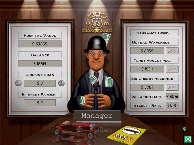 La première, c’est qu’on s’ennuie vite dans un hôpital. Les environnements sont froids, monotones et livrent très peu (en plus de l’ambiance qui y règne) une atmosphère propre à la légèreté d’esprit que Theme Park mettait auparavant en vedette et que l’équipe souhaitait retrouver dans ce successeur. Le second constat leur vient après avoir pu assister à l’opération chirurgicale d’un patient à Frimley Park, au niveau de la colonne vertébrale : c’est intéressant, certes, mais c’est éprouvant. Dès lors, la solution sera de s’éloigner de la réalité, de ne surtout pas livrer un jeu mettant en scène des hôpitaux réalistes et donc de faire preuve de fantaisie. En découleront les maladies fictives et souvent cocasses dont les patients du jeu seront atteints ainsi que le style « cartoon » de la direction artistique avec ces personnages qui évoqueraient presque Wallace & Gromit. Deux aspects que l’on retrouvera tels quels dans Two Point Hospital une vingtaine d’années plus tard et qui donneront le La au ton de la licence. Qu’il s’agisse des cursus universitaires de Campus (entourloupes, Histoire d’internet, espionnage, magie…) ou des types d’expositions dans Museum (animaux marins farfelus, fromage lunaire, fantômes…), Two Point prête systématiquement à rire et sourire, ce que les différents commentaires en off ne manquent pas de faire non plus, dans une pure veine d’humour britannique.