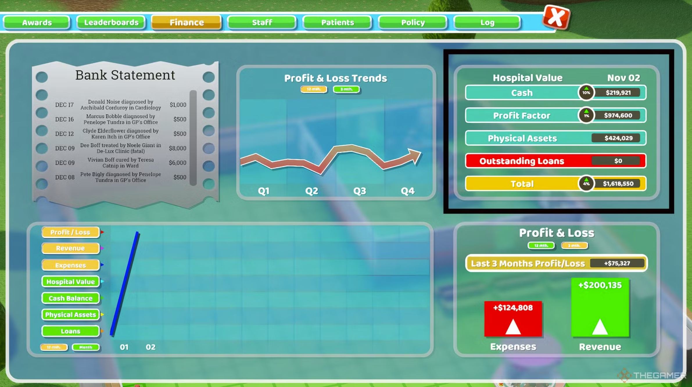 Ainsi Theme Hospital en son temps n’avait pas la santé et les résultats strictement médicaux au cœur de ses préoccupations et c’était bien la réussite financière des différents hôpitaux qui primait. Un choix qui découlait notamment de l’intention du studio de Peter Molyneux de rendre son jeu apolitique, notamment afin de ne livrer aucun message sur la question du système de santé publique du Royaume-Uni (cf. article de Gamesradar cité plus haut). On s’amusera cependant de ce soi-disant apolitisme quand on met en scène des établissement hospitaliers visant le rendement plutôt que l’efficacité médicale (quand on vous dit qu’être apolitique c’est en réalité être de droite…).