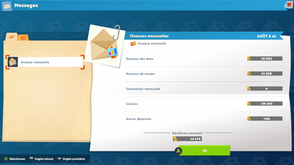 Reste que, manette en mains, jouer à Two Point Museum sur console (comme à Campus ou Hospital, les deux précédents volets) est très agréable. Le survol des musées se fait sans encombre, la gestion des différents espaces est fluide et le parcours dans les menus se veut tout à fait convenable. En fait, il apparaît que les équipes de Two Point Studios ont très bien su appliquer la maniabilité d’une souris aux sticks de la manette. Si la licence n’est pas la seule à s’en sortir honorablement en la matière, mon expérience me pousse à penser qu’on touche ici à une des meilleures façons de faire. Cela, on ne le doit d’ailleurs pas qu’à un bon travail de transposition des mécaniques mais plus globalement à une ergonomie pensée en amont comme accessible et simple à prendre en main. A bien y regarder, arpenter les interfaces des jeux Two Point n’a rien de bien sorcier et l’on s’y retrouve de base très aisément. Qu’il s’agisse – en ce qui concerne cet épisode – de la gestion des personnels, des collections ou des espaces, tous les encarts sont conçus de manière à offrir une information claire et lisible ainsi que des outils facilement trouvables et applicables.