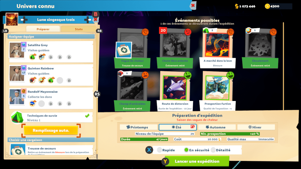 A cela s’ajoute le tout nouvel aspect cristallisé par les expéditions. En effet, les collections à exposer dans le musée ne tombent pas toutes seules dans nos espaces et il faut bien aller les chercher. Pour cela, nous devrons envoyer nos employé(e)s – qu’il s’agisse d’expert(e)s, concierges, agents de surveillance ou assistant(e)s – sur le terrain afin qu’ils trouvent de quoi enrichir les collections du musée. Diverses régions sont disponibles et se débloquent à mesure que nous progressons de musée en musée et si chacun propose d’explorer une région de prédilection en fonction de son thème, il est à la longue tout à fait possible de se rendre chaque région pour un seul et même établissement afin d’en faire un lieu aussi exhaustif que possible. Attention cependant car qui dit « personnels sur le terrain » dit également « personnels absents du musée ». Il convient donc de faire attention à ce que ces expéditions ne gênent pas trop le bon fonctionnement du musée, ajoutant donc en cela une nouvelle dimension à la gestion des effectifs. Enfin, ces expéditions impliquent de nombreux critères qui feront varier leur difficulté (niveau du personnel, aléas à prévoir, conditions météo) et des dilemmes pourront survenir de manière aléatoire. Ces derniers nous obligent à faire un choix pour l’équipe envoyée, ce qui influera sur le résultat de l’expédition (qualité de l’expo trouvée, délai raccourci ou rallongé, blessures éventuelles…).