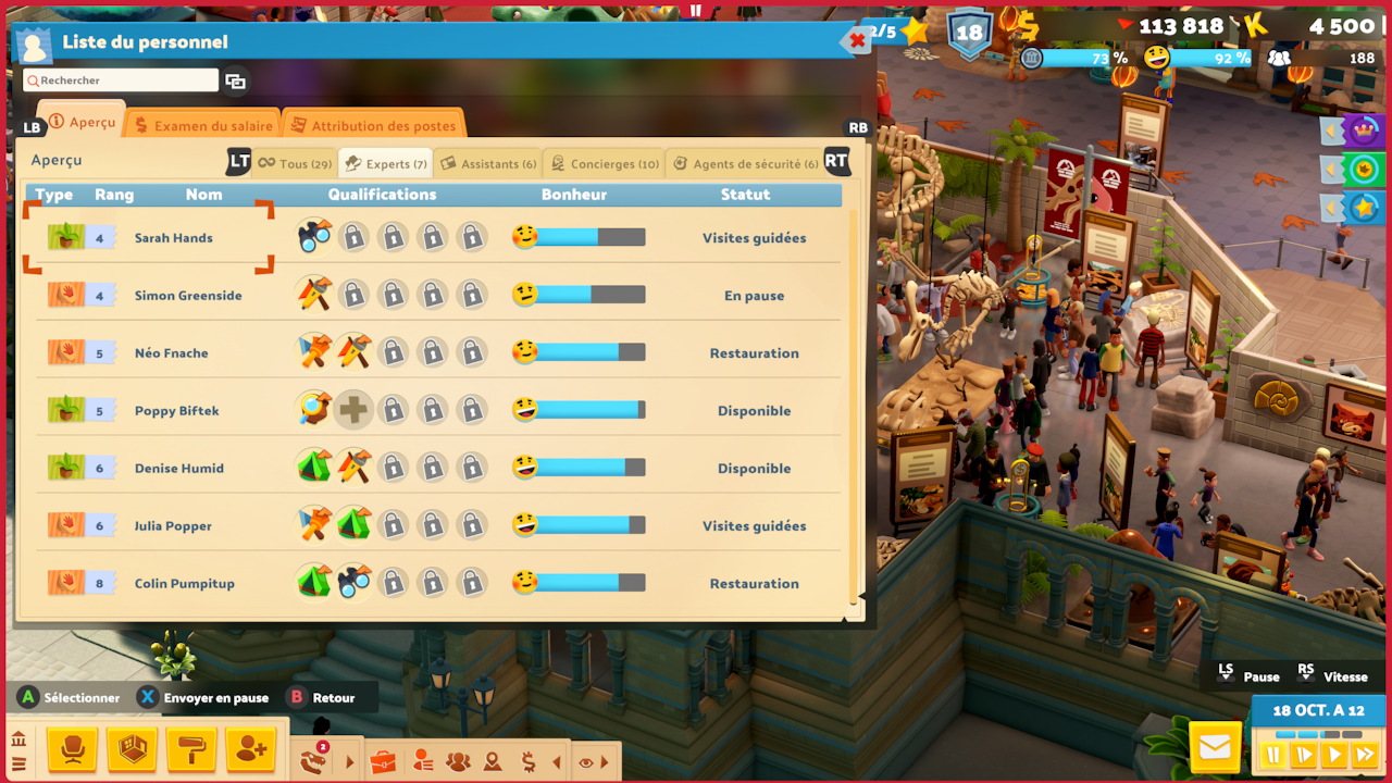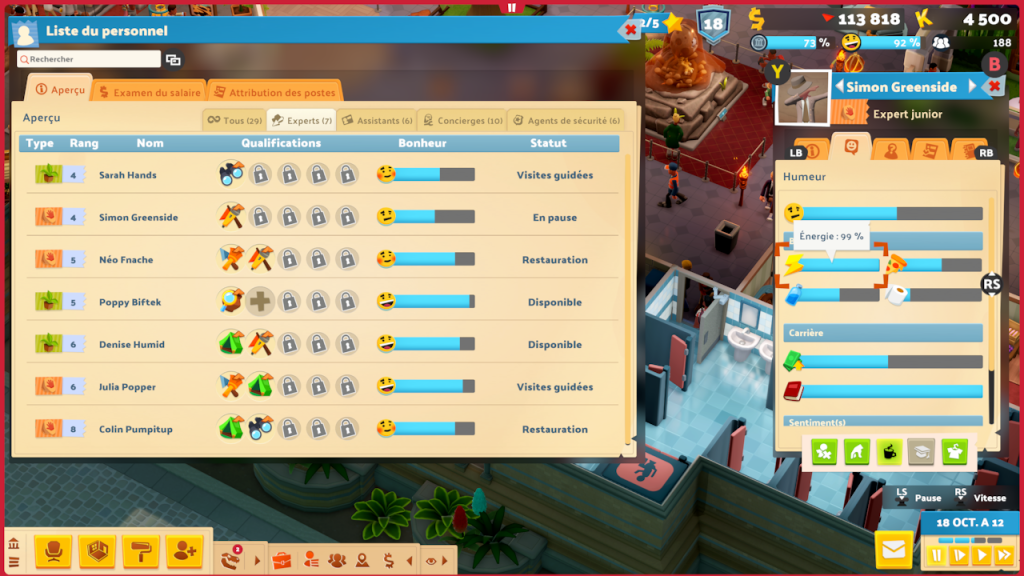 Ce que l’on retient ici, c’est que les dirigeants du studio semblent être décidés à ne surtout pas reproduire l’expérience connue chez Bullfrog et Lionhead, en permettant notamment à leurs effectifs d’organiser leurs journées à leur convenance, dans un souci de souplesse qui permettrait d’établir un cadre de travail sain et donc de favoriser le bien-être professionnel. Si la question des débuts et fins de journées ne se pose pas dans Two Point Museum, les musées ne fermant jamais, cette philosophie explique tout de même ce que l’on observe in game. En effet, en pratiquant, on se rend compte que les employé(e)s de nos musées organisent très bien leur temps de travail sans notre aide. S’il arrive parfois que l’on affecte telle ou telle personne à un poste donné (hors expéditions, lesquelles nécessitent une planification spécifique), c’est le plus souvent pour répondre à un besoin très occasionnel.